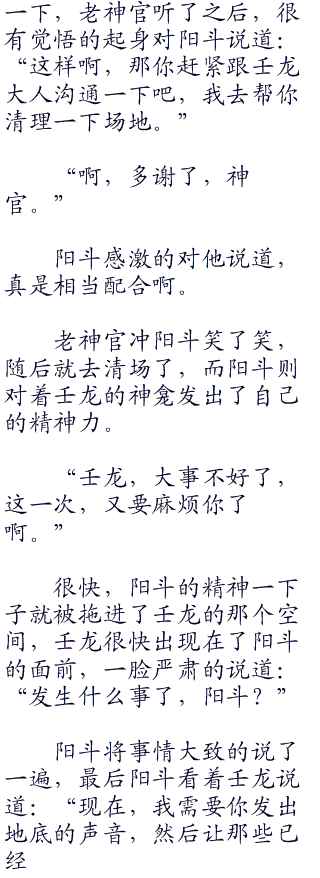 阳斗听后抽了抽嘴角,然后没好气的说道:“说人话!”