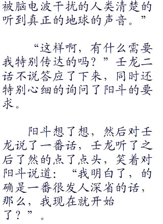 伊卡尔斯星人一滞,不由得无语的说道:“据我发现,她所发出的脑电波干扰是让人类误以为自己听见了地球的声音,而大概内容就是地球认为人类是毒瘤,然后要让人类为自己的后代让出空间,要安排他们去自杀。”