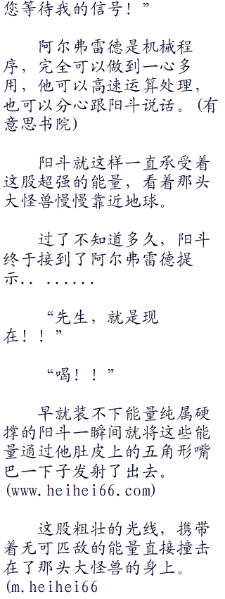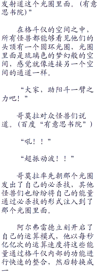 阿尔弗雷德立刻对格斗仪的怪兽们下令道:“请各位将能量聚集到最顶点,然后全部