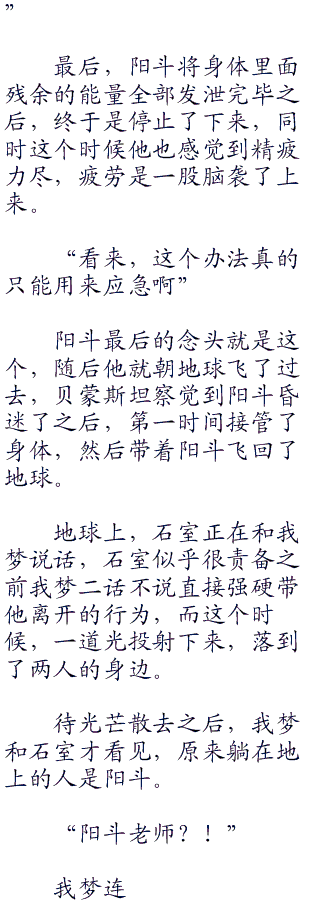 石室和我梦他们都愣住了,这个时候,阳斗从怪兽的身后飞了出来,露出了他的身影。