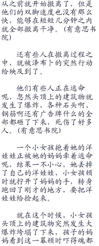 泽布卜说完,忽然用右手朝一个地方指了过去,只见被他所指的一栋楼房顿时发生了大爆炸。