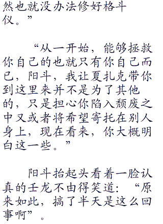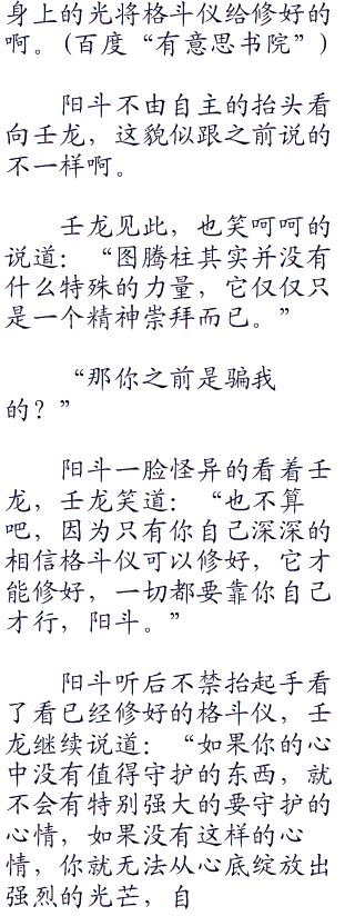 壬龙笑着对阳斗说道,阳斗有些迟疑的看了看壬龙,随后抱着试一试的想法,低头看了看手中的格斗仪,不由得看着那根图腾柱说道:“如果可以的话,我想再一次获得去守护的力量,保护我心中想要守