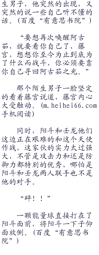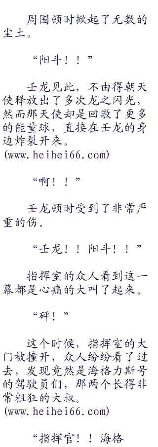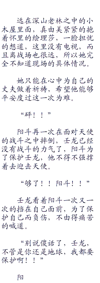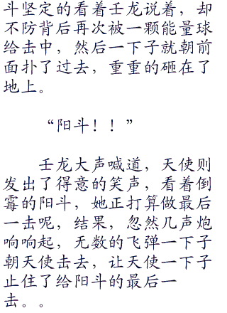 那天使被两人打了一个措手不及,还伤到了自己,她顿时气得,不停的朝阳斗和壬龙发动攻击,而阳斗和壬龙就在这些能量光弹的攻击下不停的躲闪颇有些夹缝之中求生存的意思。