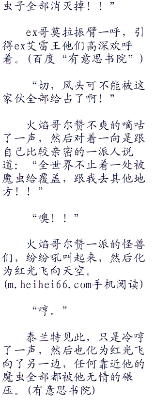 ex哥莫拉带领着格斗仪之中的所有怪兽,朝天空的那些德比西魔虫攻击了起来,爆炸声不停的响起,无数的魔虫死在了他们的绝招之下,本来已经被遮蔽了的天空慢慢恢复了他原本的模样。