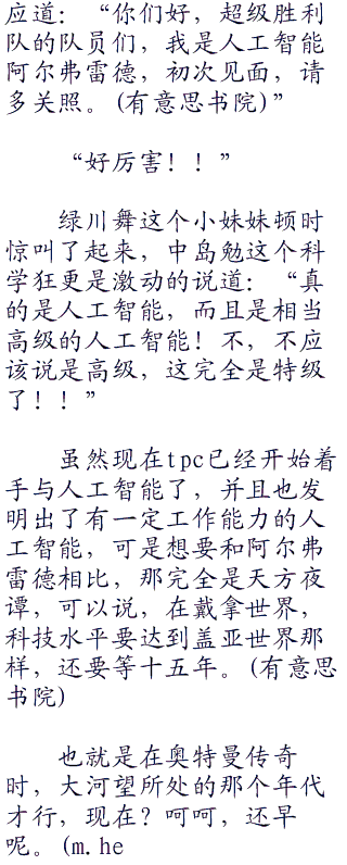 “这是人工智能,这座研究所除了我还有右之外,就是他在管理了,噢,对了,他叫阿尔弗雷德。阿尔弗雷德,跟我们的朋友打个招呼。”