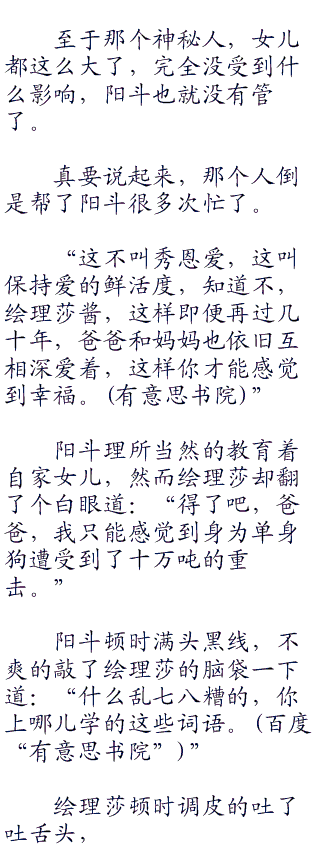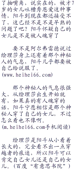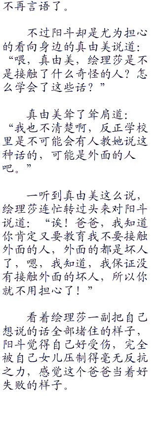 就这样,绘理莎都还嫌小学六年级的知识太幼稚了,要不是阳斗考虑到绘理莎应该交更多同龄的朋友,以绘理莎的接受能力和她的知识水平,她现在应该读高中的