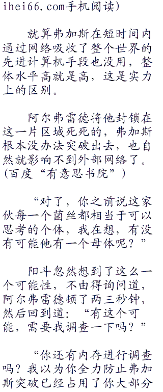 “你是一个特殊的人才,应该明白人类已经进化到头,可我的进化还在进行着,我的所有菌丝都拥有独立思考的能力,而我的菌丝遍布十公里的范围,相当于我拥有一个十公里的大脑,而这,还只是一个开始。”