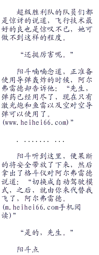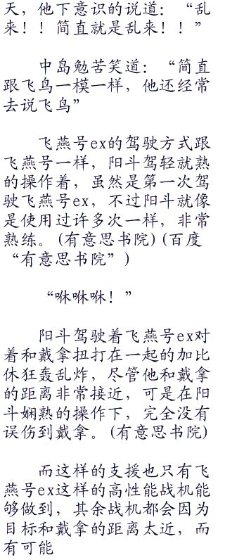 听了阳斗的话之后,喜比刚助本能的有些不喜,不过事实却是如此,不由得他不接受,飞燕号ex优越的性能是他亲眼所见的,他们队里的战机的确是比不上飞燕号ex。