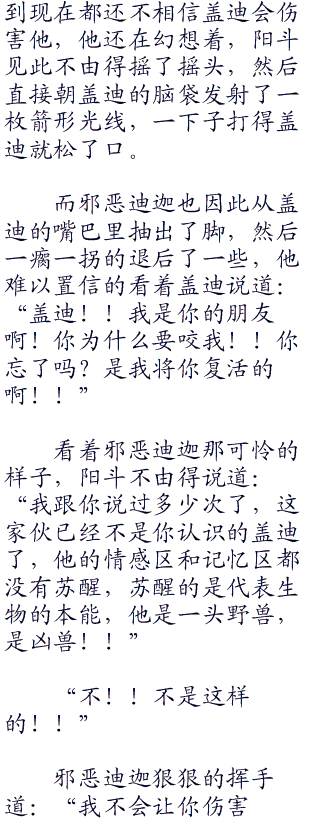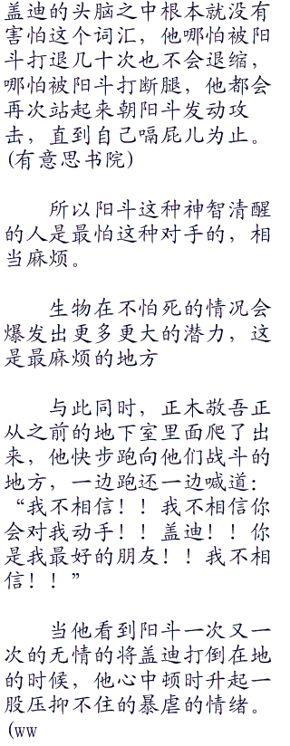 而此时此刻,阳斗和盖迪的战斗正打得有声有色,本来阳斗的战斗力是远高于盖迪的,可是俗话说得好,软的怕硬的,硬的怕横的,横的怕愣的,愣的怕不要命的,盖迪就属于不要命的那种。