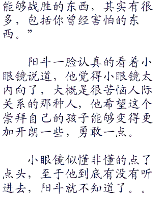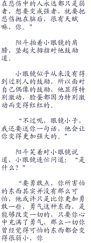 阳斗轻轻拍着小眼镜的脑袋夸奖着他,小眼镜顿时腼腆的笑了起来。