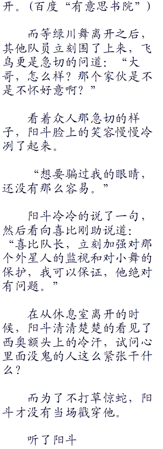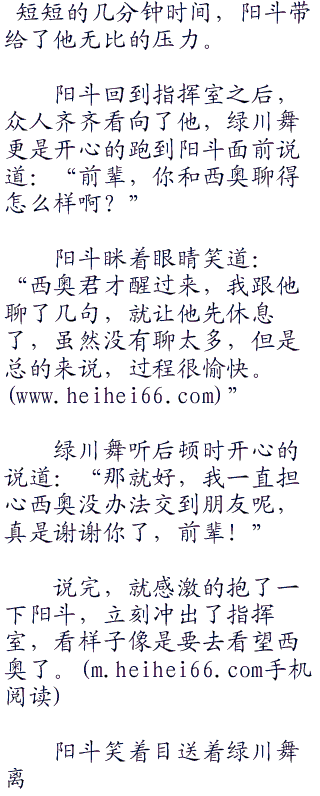 阳斗笑嘻嘻的目送着绿川舞离开,整个房间里面就只剩下了阳斗跟这个名叫西奥的外星人了。