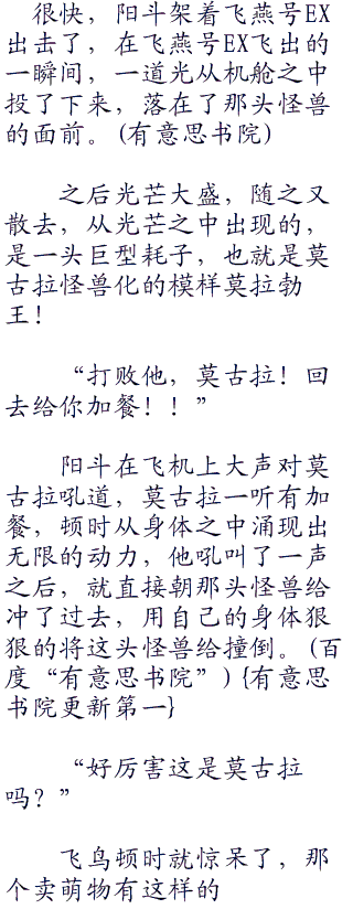 一路上,阳斗对莫古拉说道:“莫古拉待会儿你去对付那个怪兽,我来对付那个西奥,你放心,我会好好帮你报仇的!”