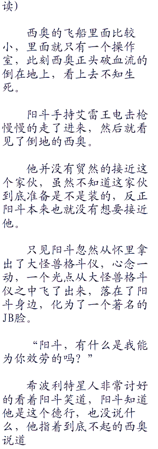 阳斗并没有被吓到,而是宠溺的摸了摸他的脑袋,莫古拉站在阳斗的肩膀上,一手指着画面中的宇宙飞船,一边比划着,看他咬牙切齿的模样,阳斗不由得笑道:“怎么?你想对付他吗?他对你做了啥,你要这么报复他?”