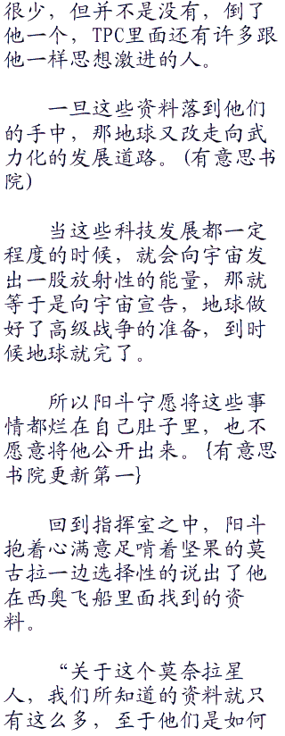阳斗听后,不由得冷笑道:“你估计是听错了,我说的是将你从玻璃罩里面放出来,而不是说放你离开。你探查了我们这么多秘密,你觉得地球人会让你离开吗?”
