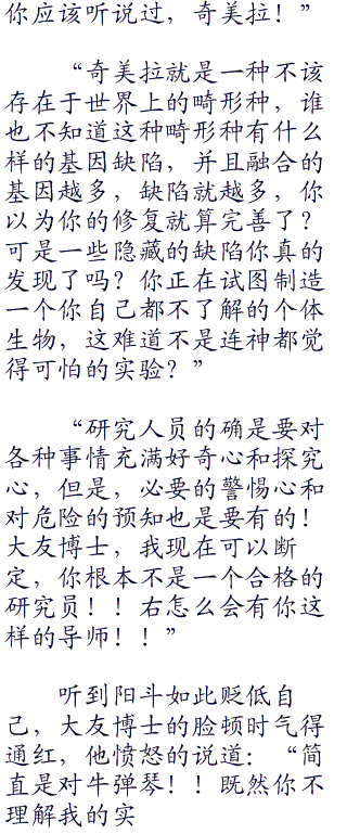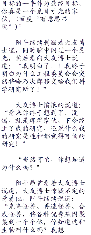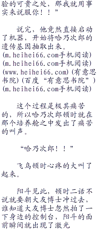 阳斗皱着眉头紧盯着大友博士,大友博士摇了摇头,说道:“当然不是,除了哈乃次郎的遗传基因之外,还需要其他东西的辅助,但是不可否认,这是不可或缺的东西,是我的实验之中最重要的一环!”