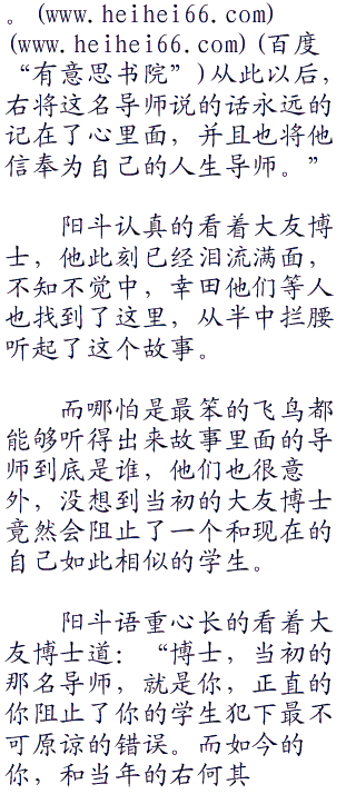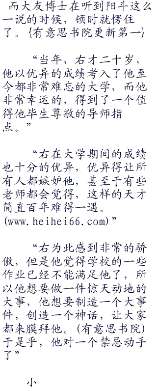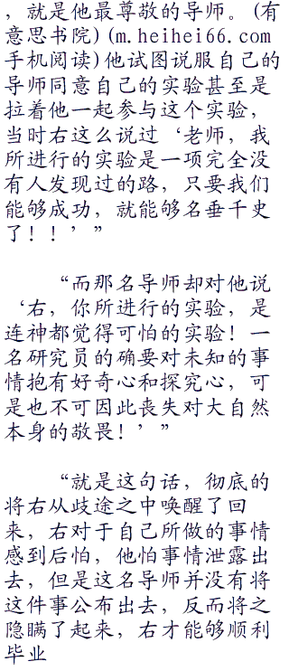 “知道吗?博士,在我来之前,右曾经跟我在电话里面说,自己的导师是一个多么正直的人。我也是在电话之中才得知,原来右当年还是学生的时候,曾经犯过一个不可原谅的错误。”