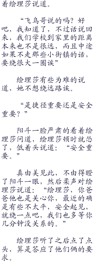 这是一天下午,绘理莎所在的中学放学了,她和几个女同学背着书包走出来,由于绘理莎年纪小,成绩优秀,为人又很和善,所以身边的朋友一向很多,而且这些朋友还特别照顾她。首发