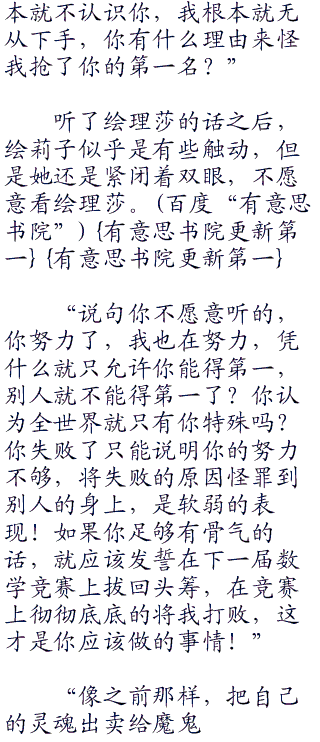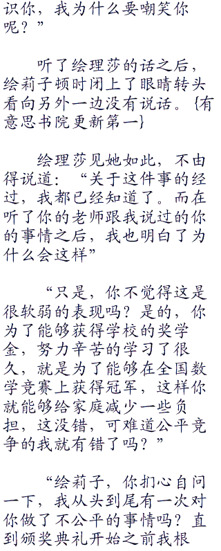 绘理莎顿时有些无奈的说道:“我从来都没有想过要嘲笑你,是你自己认为我要嘲笑你的。在那之前,我根本就不认