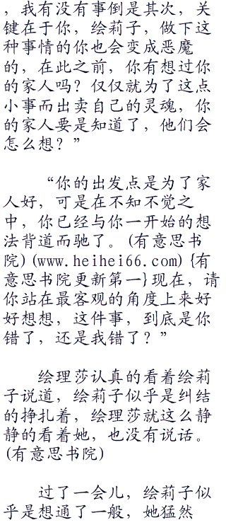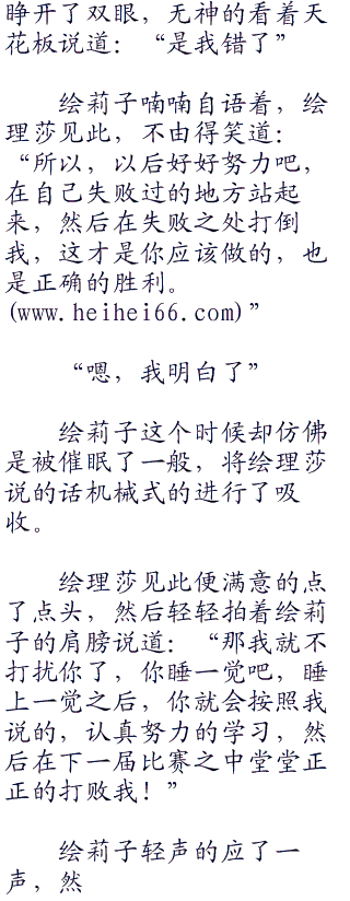 过了一会儿,绘理莎忽然开口说道:“我知道你究竟是为什么要这么做,我也知道我这么说话你其实也听得见,不过,我还是希望你能够清醒过来,因为,这个现实你总是要面对的”