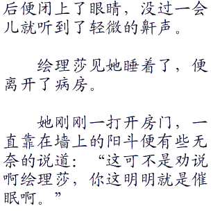 绘理莎走到了绘莉子的病床边,看着绘莉子仍旧昏迷不醒的样子,不由得叹了口气,她已经听医生说了,了解了绘莉子的这种情况,是对现实逃避的行为