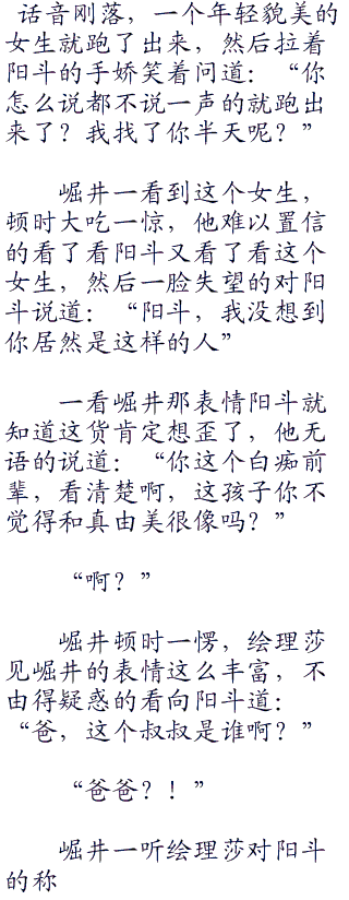 阳斗翻了个白眼,对绘理莎的狡辩无话可说,他知道,绘理莎其实就是觉得方便而已,在懒字这上面,绘理莎倒是遗传得妥妥儿的。