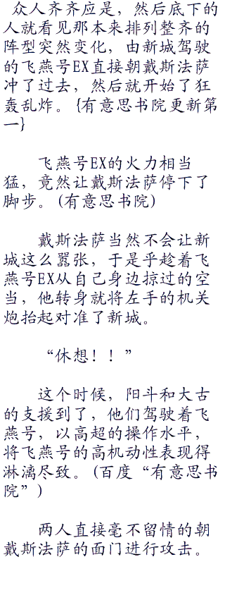 新城驾驶着飞燕号ex正好给戴斯法萨补了一刀,通过短短的一番操作,他瞬间喜欢上了这台高性能的战机,然后兴奋的在同队频道之中对阳斗说道。