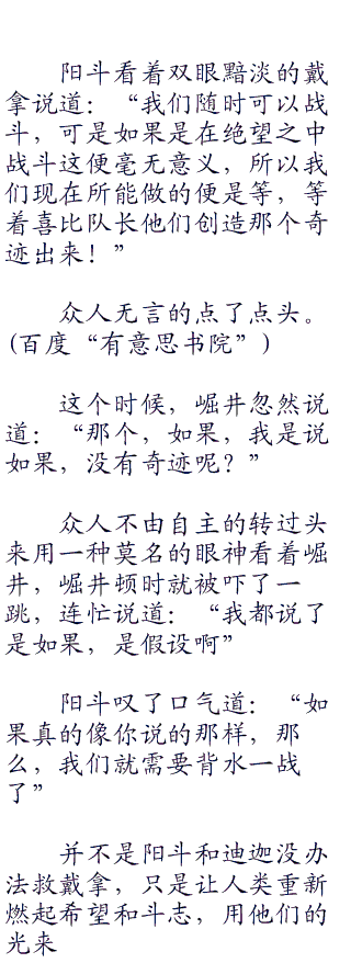 “这种程度的威胁我们早就经历过一次,然而事实证明,人类自己的绝望才是造成地球毁灭的罪魁祸首,所以直到最后都不能放弃才是自救的唯一办法。”