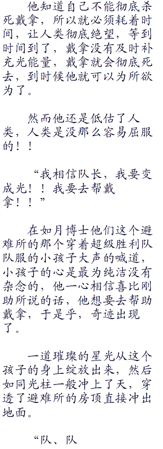 “我从他们的记忆之中看到了他们对我们人类的害怕,虽然他们嘴上说着不屑一顾的话,可是实际上,他们却是做了大量的准备,想尽各种办法来消磨我们的斗志,让我们彻底绝望!只有这个样子,他们才能够安心的消灭我们,而不担心我们反抗。”