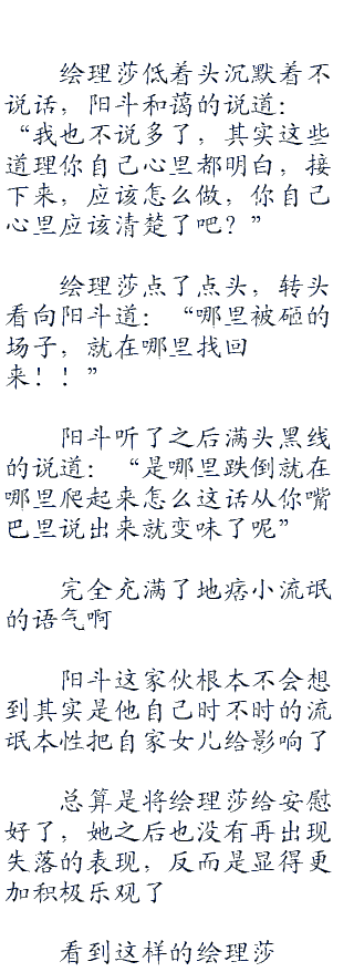 得到绘理莎的同意之后,阳斗才打开门,走进了自家闺女的房间,看着有些闷闷不乐的绘理莎,阳斗不由得说道:“还在为那件事不开心吗?”