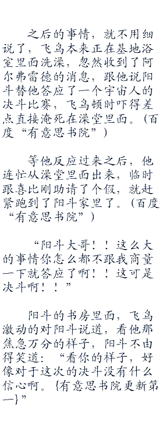 这一天,阳斗正询问着阿尔弗雷德飞燕号ex的改造进度,阿尔弗雷德刚刚报告完,便对阳斗说道:“先生,我收到了一封挑战信”
