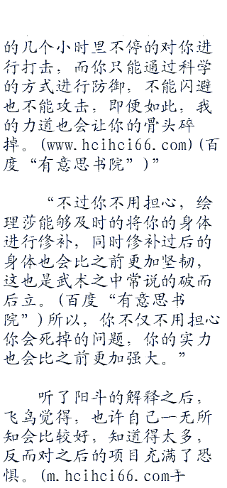 阳斗微微一笑道:“绘理莎让你的身体反应速度增加了一倍,这样你就有可能在今天完成训练了,同时,这也锻炼了你在超快频率的适应力,别停。”