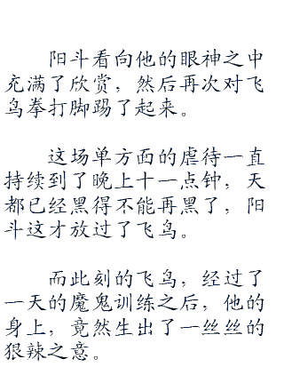 还好,在绘理莎的速度加持之下,飞鸟在下午四点钟左右,就完成了阳斗交给他的训练计划。