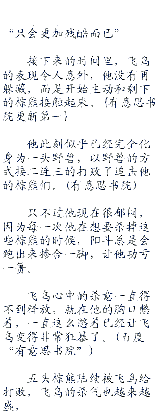 飞鸟此刻的力量和抗击打能力都不比这头棕熊要差,一人一兽你来我往的情况下,竟然是飞鸟还占了上风。