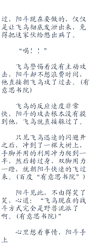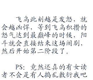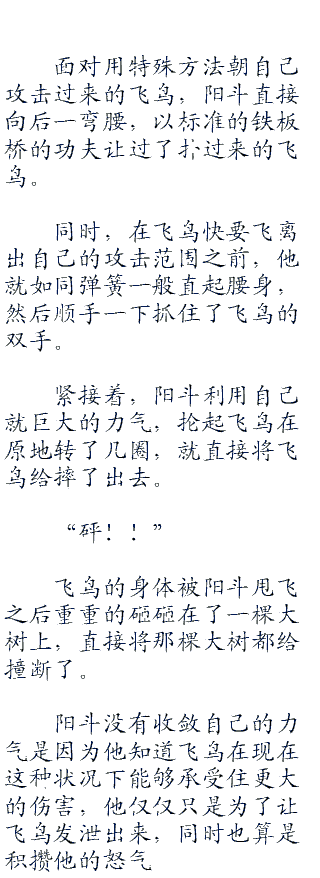 阳斗瞬间出现在了他身后,飞鸟好像有所感应一般,准备转头攻击阳斗,可是阳斗的速度却更加快的一脚将飞鸟给踹飞了。
