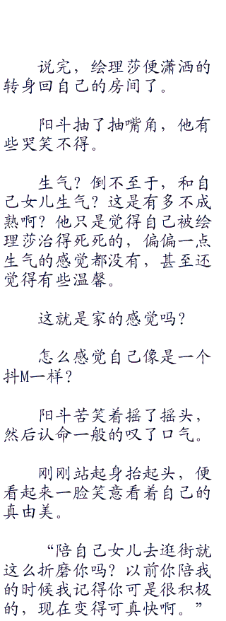听了阳斗的话之后,绘理莎吐了吐舌头笑道:“好啦,我知道了,爸你又开始教育我了。”