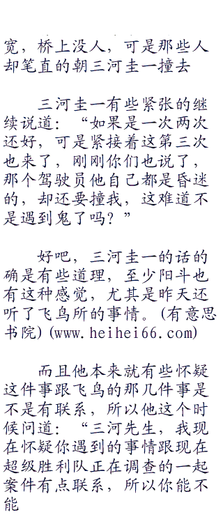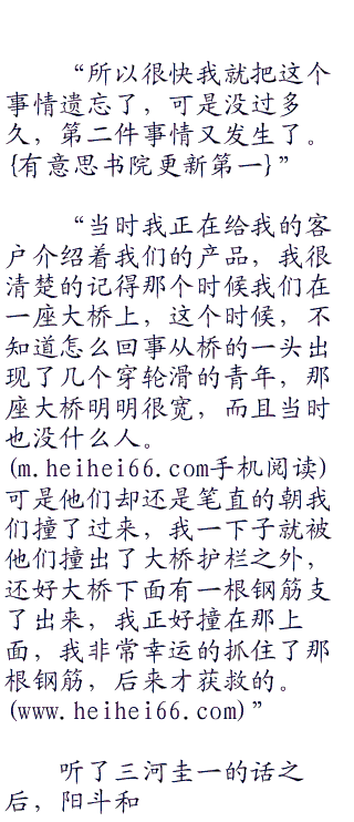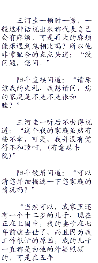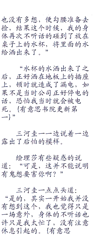 三河圭一尴尬的笑了笑,然后继续说道:“事实上,这已经第三起我认为发生得很诡异的事情了,我总觉得我的身边有什么脏东西跟着我,想要害我”