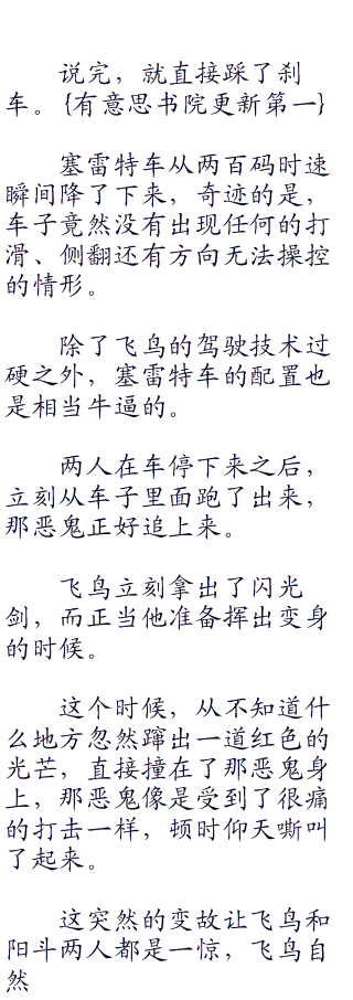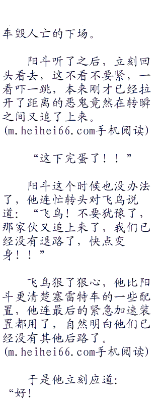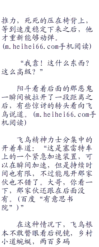 那恶鬼追击的速度非常快,飞鸟不得不加大的马力,同时,因为农村的道路有些狭窄,导致塞雷特车不得不为了避让一些东西,而东倒西歪的。.首发