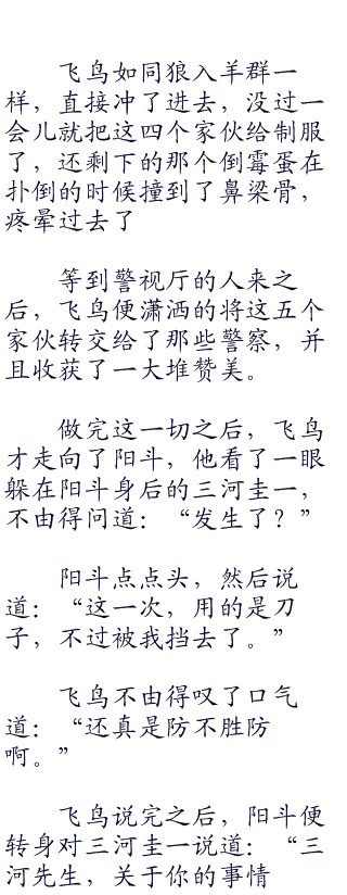阳斗并没有阻止他,反而是跟飞鸟一起下了楼,在来到马路上之后,阳斗对飞鸟说道:“我在这里待着保护三河圭一,你自己去吧。”