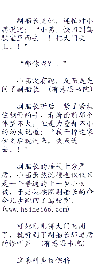 小茜看到这一幕也惊呆了,这个时候,副船长连忙拿起一根钢管将小茜护在身后说道:“小茜!!快躲在我身后!!”