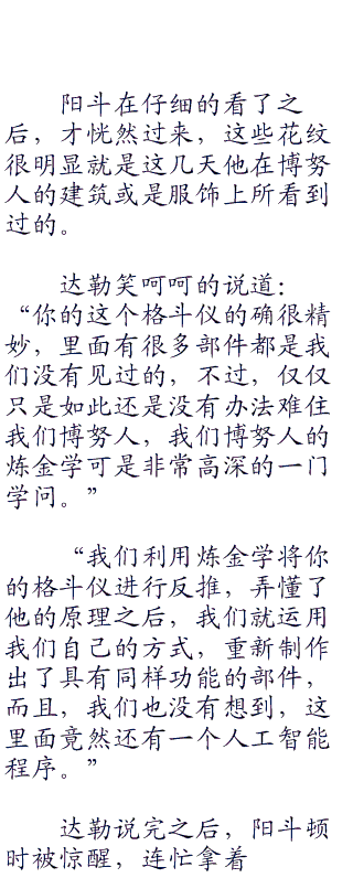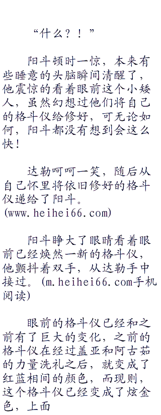 “所以我觉得,你不应该这么沮丧,相反,你应该随时保持战意,说不定长老明天就能把你的格斗仪给修好,那时,你就可以去拯救你的故乡了。”