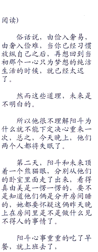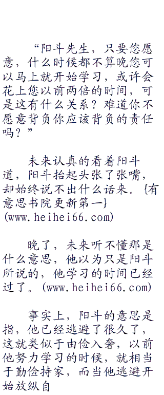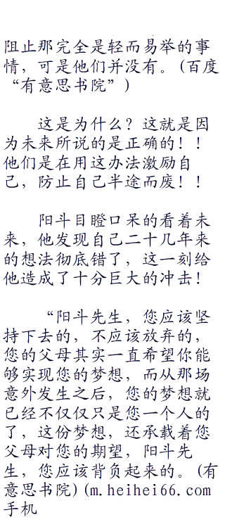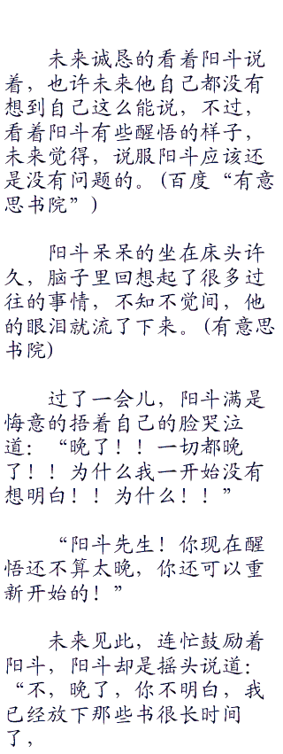 未来微微长大了嘴巴看向阳斗,阳斗凄笑了一声,然后道:“很讽刺吧,一直质疑我的父母,却为了想要看到我成功的那一刻身亡了?也许,我从一开始就不该追寻这个可笑的梦想,如果能够老老实实的听我父母的安排,他们也许就不会离开了。”