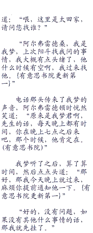 就在这个时候,家里的电话忽然响了,阿尔弗雷德连忙对未来说道:“抱歉,未来君,我得下去接个电话。”