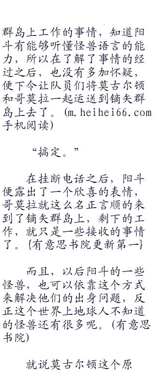 “别装可怜了,我那一下可没有那么重如果你不喜欢那些微波骚扰你的生活的话,倒是可以去另一个地方,那个地方叫镝矢群岛,上面有很多和你一样的怪兽在那里生活,你到了那里之后,就不会有现在的烦恼了。”