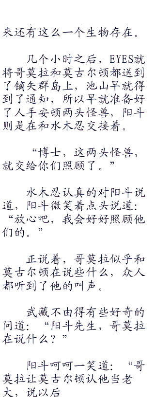 于是乎,本来还很担心哥莫拉伤害莫古尔顿的eyes队员们,就看见哥莫拉竟然蹲下身来,很温柔的摸着莫古尔顿刚才被打的脑袋。