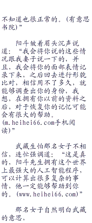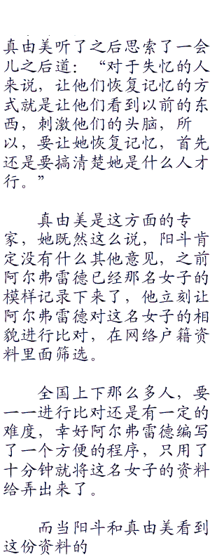那名女子听了阳斗的话之后,不由得眼前一亮,然后说道:“其实,我现在的情况很简单,我是一点都想不起以前的事情,只不过只要一开始回忆,脑海之中就会出现一个词语。”