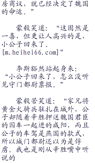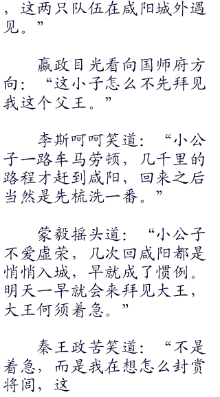 马车跟随在囚车之后,缓缓走进咸阳,小黎掀开车窗的一丝缝隙,看着载歌载舞的咸阳人,目光扫过囚车,魏国君臣一个个脸色惨白,在惊恐中发抖。