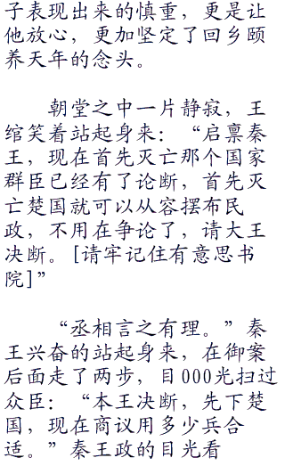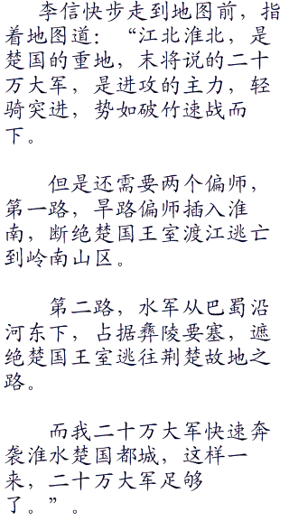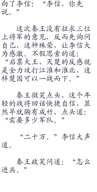 将闾和李斯一唱一和,让满朝文武全都感到惊讶和震惊,这二人对楚国的论述,并不是从战争的角度看待楚国,而是以治国的角度看问题,这对于一向崇尚武力,去征服敌国,去掳掠财物的大将是一个启迪。这是一个独特的视觉,不仅是大将们在考虑,就连楚王也在思索。