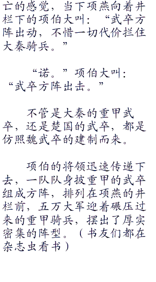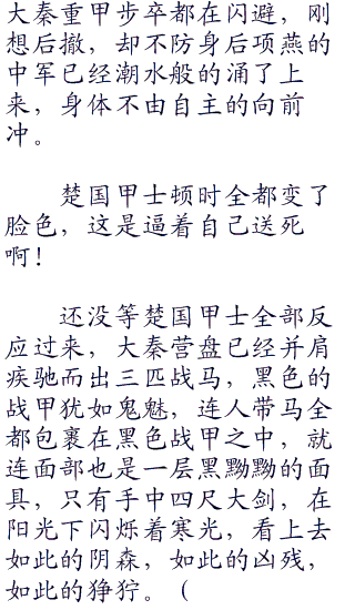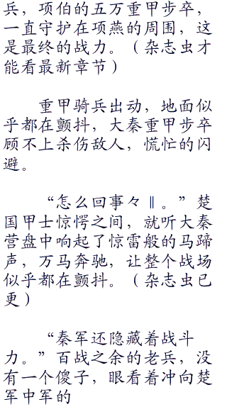 一名传令兵骑着一匹快马飞驰而来,一边纵马狂奔,一边仰天长嚎:“上将军有令,重甲骑兵和黄金火骑兵,突击项燕中军。”