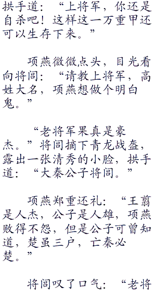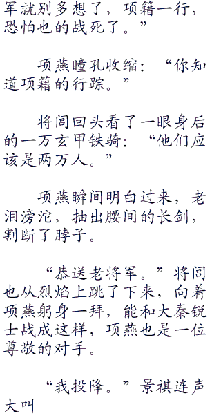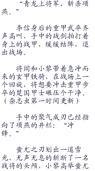 三十里地的战场,交织着大秦和楚国八十万大军,玄甲铁骑一个冲锋只闯进了十里,将闾骑着烈焰,小黎骑着追风,聚气成刃和蚩尤之剑一白一红两道剑光冲天而起,无数个人头滚落。