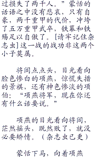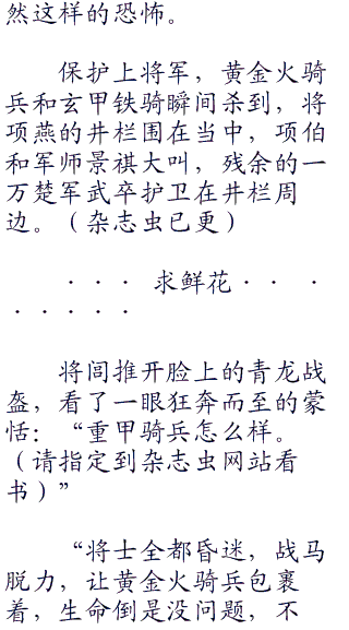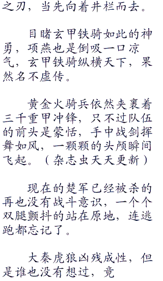 但现在三千重甲已经开始乏力,蒙恬不在犹豫,大喊一声,黄金火骑兵追随这统帅,瞬间将三千重甲包裹在马队之中,向着项燕的井栏直接冲杀过去。